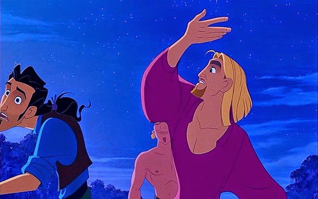 There is a lot about "The Road to El Dorado" that I really enjoyed. Fantastic animation from James Baxter and many other animators, superb character design, witty dialogue but what I liked best were the staging choices from this film. In the sequence below, the heroes, Miguel and Tulio, narrowly escape death by giant rampaging stone jaguar and end up on the ceremonial ledge leading to Xibalba (or a long drop off the cliff to a whirlpool below). The situation presented here consists not only of how will the two get past the blood thirsty Tzekel-Kan but how to get the two heroes to confront the growing animosity toward each other while moving safely away from the cliff edge? I really love this part in how the film makers found their answer. So I grabbed and split the scene up shot by shot showing many main keys along the way. James Baxter's Tulio acting to Kevin Kline's dialogue is absolutely brilliant here, but watch how Tulio tries to encourage Miguel into conning Tzekel-Kan and Miguel wanting nothing to do with it. So Tulio tosses Miguel toward Tzekel-Kan as the two heroes argue. Slowly, with great subtlety, the two walk past the antagonist and hit each other, ending by landing a double punch on Tzekel-Kan's face, thereby sending Tzekel-Kan to the cliff edge and allowing Tulio and Miguel to take the place of safety. This is fantastic scene planning from story and layout all the way through to final animation.